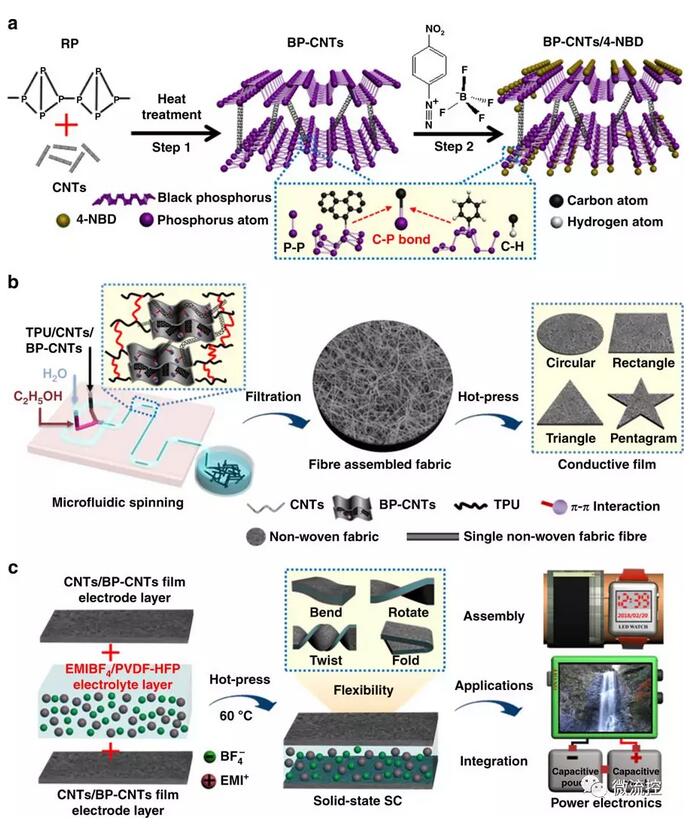 據研究組陳蘇教授和吳冠教授介紹,該團隊將碳納米管原位橋接在導電性差的黑磷材料層之間,大大提高了層間電子轉移效率。此外,由于黑磷易于像石墨烯一樣在層間堆積,添加碳納米管有效地減少了黑磷層的積累,增加了比表面積,增加了離子吸附表面,增加了離子的擴散速率和積累,并使黑色磷具有大的離子擴散通道。此外,該團隊采用黑色p復合紡絲溶液,通過微流體紡絲技術拉制,固化并融合到黑色p微納米復合纖維的無紡電極材料中,具有高功能導電性,高能量密度和優異的柔性超級電容器。靈活的超級電容器具有高度的靈活性和變形能力,可以集成到織物中,為可穿戴設備提供能量。